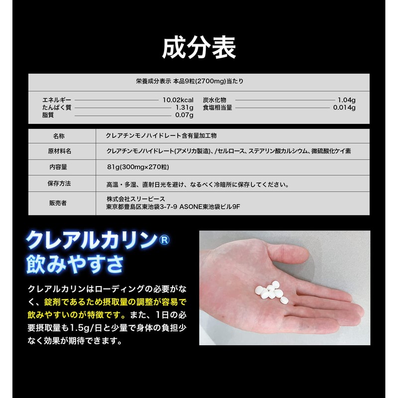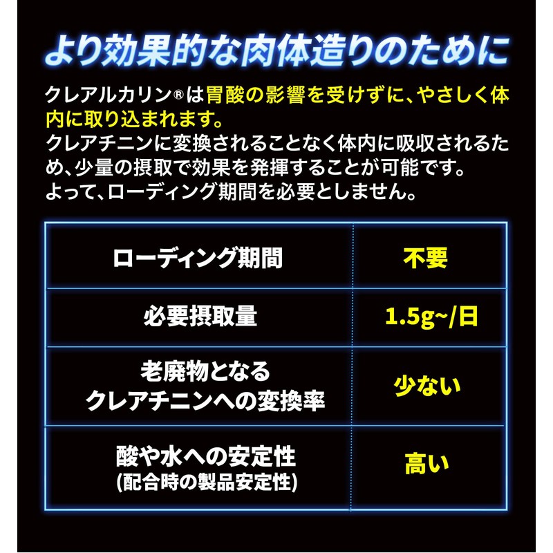 - 【効果的なパフォーマンス向上をサポート】クレアルカリンは体内への吸収性を高めたクレアチンで、適切な摂取によりパフォーマンス向上をサポートします。