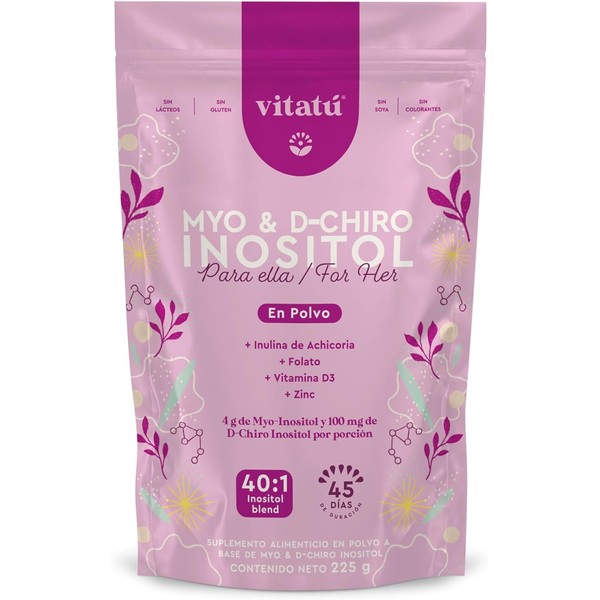 - 🌷 MYO & D CHIRO INOSITOL VITATÚ es un suplemento diseñado para mujeres a base de Myo Inositol, D-Chiro Inositol, Zinc, Folato y Vitamina D3. ✨ Relación 40:1 de Myo + D-Chiro Inositol. 4 g Myo Inositol por porción + 1 g D-Chiro Inositol por porción. ✨Sin azúcar añadida, gluten, lacteos, soya, saborizantes, colorantes o endulzantes artificiales