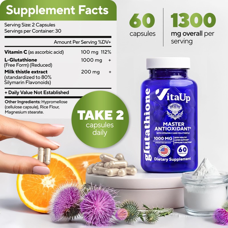 - ADVANCED FORMULA: Experience the benefits of our triple antioxidant L-Glutathione blend. Each serving of VitaUp's glutathione supplement delivers 1000mg of reduced glutathione powder, 200mg of milk thistle, and 100mg of vitamin C powder. This powerful formula helps maintain overall well-being with just 2 capsules daily.*