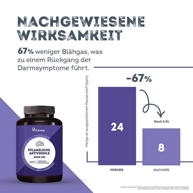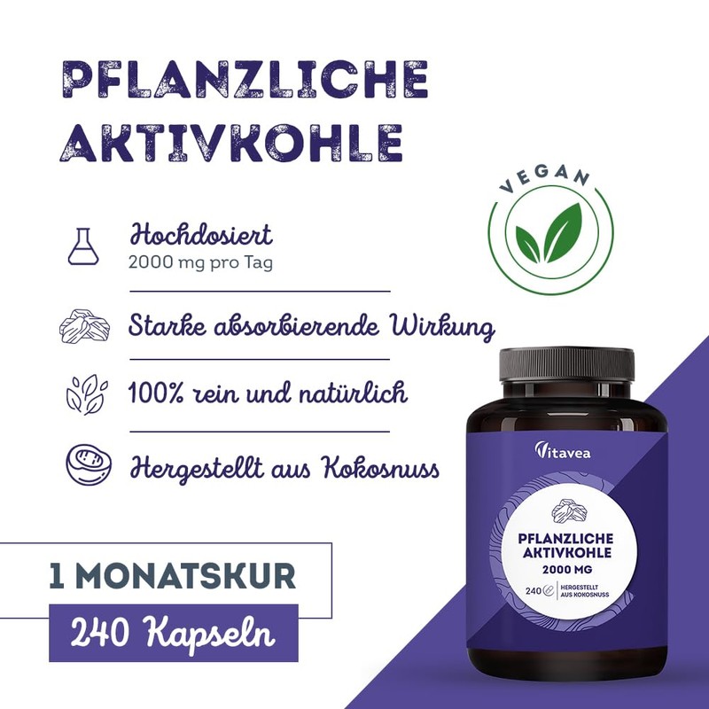 - Nutritional supplement activated charcoal: this Vitavea dietary supplement with vegetable charcoal in the form of activated carbon tablets is your reliable aid for discomfort with digestion; the formula consists of the star active ingredient activated carbon, which ensures the well-being of digestion; the dietary supplement is particularly effective for flatulence and intestinal gases as part of a healthy and balanced diet. or Darmkurung or inteto promote a flat stomach