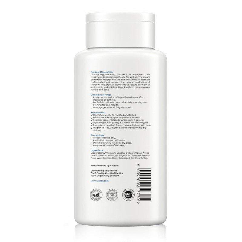 Application: Vitilox Vitiligo Pigmentation Cream is best applied to the affected areas of your body once or twice a day, after bathing.