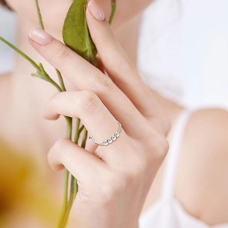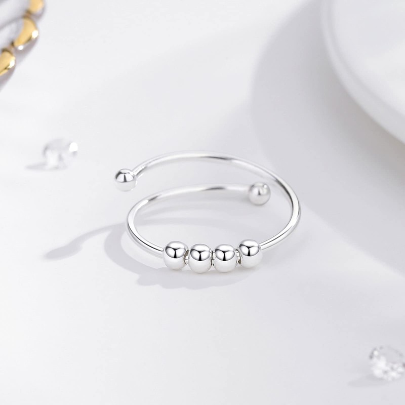 Vito Sterling Silver Anxiety Fidget Ring for Women, Adjustable Open Spinner Ring with Rotatable Beads, Expandable Stress Relif Jewelry Gifts for Mother Daughter Office Workers