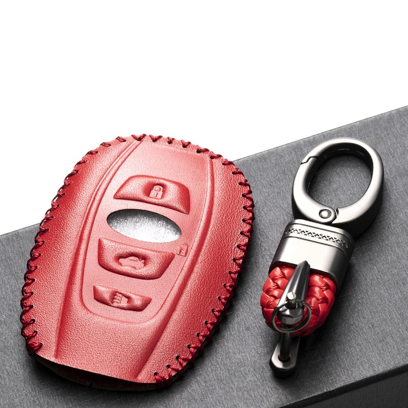 Vitodeco Leather Keyless Entry Remote Control Smart Key Case Cover with a Key Chain for Subaru Forester, Impreza, Outback, WRX, BRZ, XV Crosstrek (4 Buttons, Red)