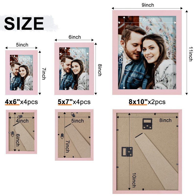 • Multi Sizes for DIY: 10 Pack pink multiple photo frames includes 2pcs 8x10 frames, 4pcs 5x7 frames and 4pcs 4x6 frames. You can freely combine these different sizes of photo frames. One set of frames can meet your needs for multiple sizes of photo frames at the same time