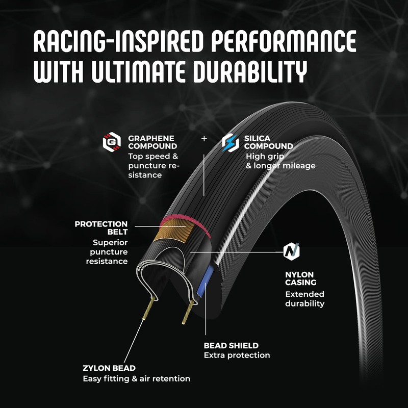 - Tubeless ready tire (hookless compatible); Size: 27.6 x 11.8 inches (700 x 30 C); Weight: 10.6 oz (310 g); Color: All BLK; The race-inspired speed and feel with nylon construction provides durability for everyday use. In addition, the new combination of silica and graphene compound has improved rolling efficiency, grip and abrasion resistance. The tread pattern is based on the CORSA series for superior grip and handling performance. The CORSA N.EXT name combines the meaning of "N" in Nylon Casing and Next Generation