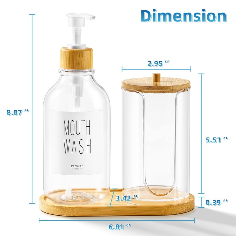 VITVITI Mouthwash Dispenser for Bathroom, Mouth Wash Pump Bottle with Paper Cup Holder, 17Oz Refillable Clear Mouthwash Container with Bamboo Lid/Tray/Label