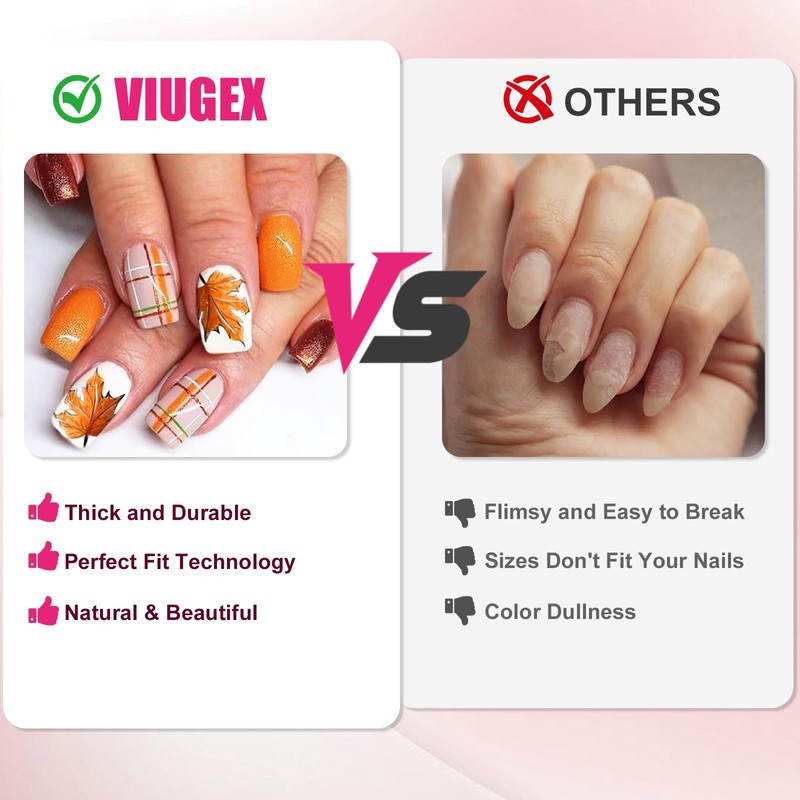 - 【Say Goodbye To Nail Polish】Experience the new generation of press-on manicure with VIUGEX. These ready-to-wear stick on nails require no nail polish, UV lamp, or drying time. You can achieve a salon-quality look in just minutes from the comfort of your home. No more 2 hour salon trips or high costs, enjoy stunning nails anytime, anywhere with ease and convenience.