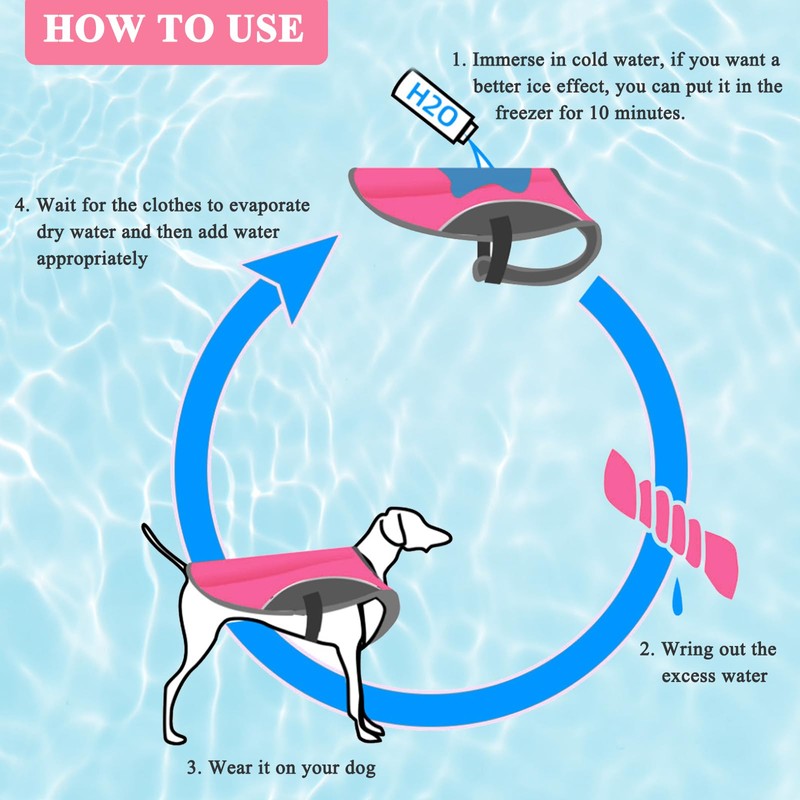 - Cooling Theory - Soak it in cold water, wring it out (it must be a little dry) and put it on your puppy. Evaporative cooling theory replaces the dog's heat by evaporating water from the coat's reservoir and dropping the temperature through the moisture-wicking outer layer. Simply repeat the steps if you feel that the vest needs to be "charged".