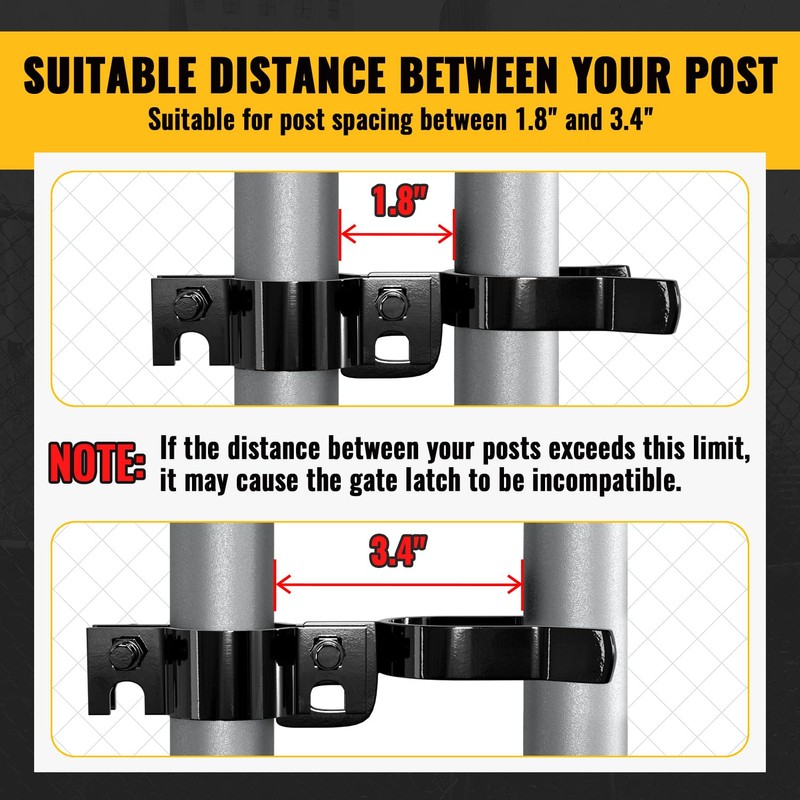 - 【NOTE】Suitable for post spacing between 1.8" and 3.4". If the distance between your posts exceeds this limit, it may cause the gate latch to be incompatible.