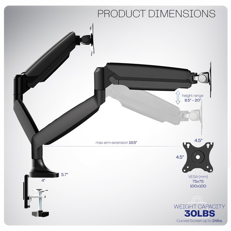- Pneumatic Arm Dual Ultrawide Monitor Mount: Work in comfort with this dual counterbalance desk mount from VIVO. The mount securely holds 2 ultrawide screens and features a powerful pneumatic spring lift for smooth, ergonomic height adjustment