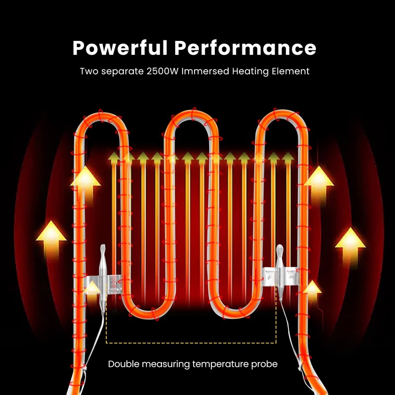 - Package Include: 2 x 2500W Immersed Heating Elements, 2 x 10.36 QT oil tank containers, 2 x 6.35 QT removable baskets, 2 x Temperature Control and Overheat Protection (230℃/446℉), 2 x Timers