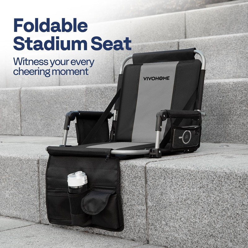 - THOUGHTFUL FEATURES - The VIVOHOME folding stadium seat includes a cup holder and a convenient bag on each armrest, a zippered storage bag, a cup holder, and a cover pocket beneath the seat, as well as a large storage pocket in the backrest for larger items such as posters or magazines; These bags provide ample space for your essentials, allowing you to keep your hands free to cheer for your team