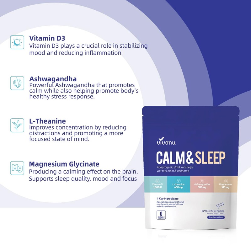 - REFRESH, RELAX, REFOCUS: VivoNu Calm & Sleep supports you in effortlessly enjoying relaxation and focus anytime, anywhere. Savor the vibrant flavors of raspberry in convenient, on the go packets or the multi-serving canister while promoting your body's vitality and equilibrium.
