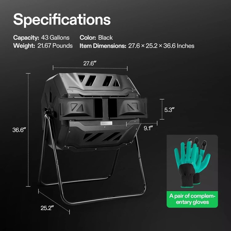 VIVOSUN 43Gal Outdoor Dual Chambers Composting Tumbler Bin Fertile 360° Rotation