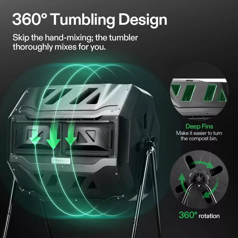 • 360⁰ Tumbling Design: The rotating design prevents you from digging or mixing the pile by hand; And the deep fins on eight panels make it easier to turn the compost bin