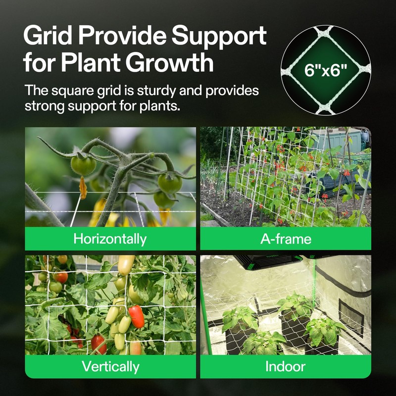 - Square Mesh: Designed with 6 x 6 inch holes, the netting leaves enough room to reach through, prune, and pick; Use it for tomatoes, peas, cucumber, beans, or any plant that needs support