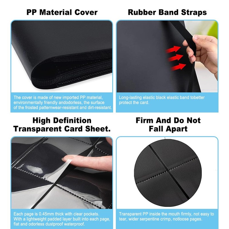 Durable and durable trading card album: PP (polypropylene) material for easy card insertion. Transparent inside pages make it easy to read; in the trading card album, cards and vouchers can be kept away from water and dirt.