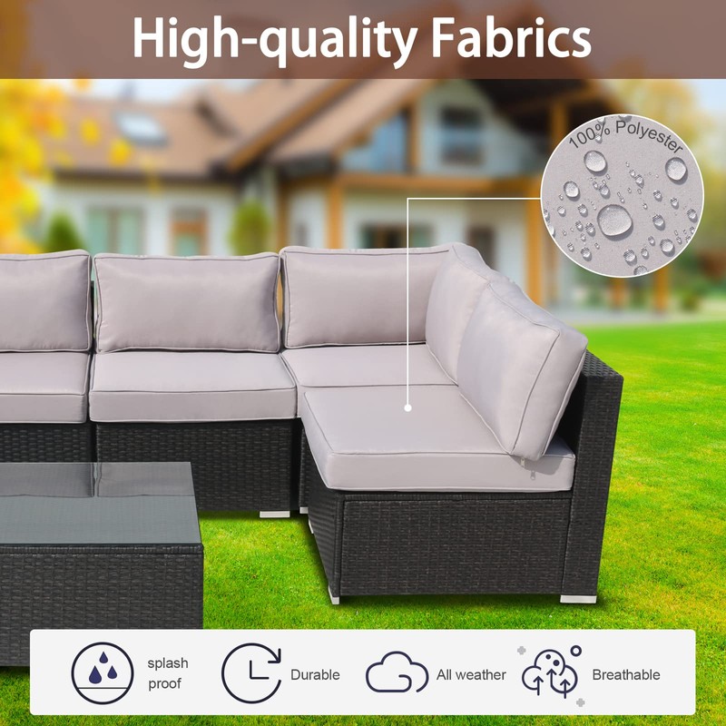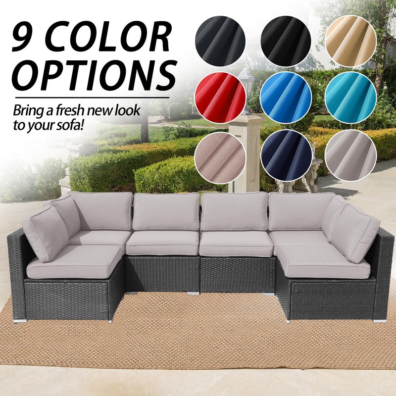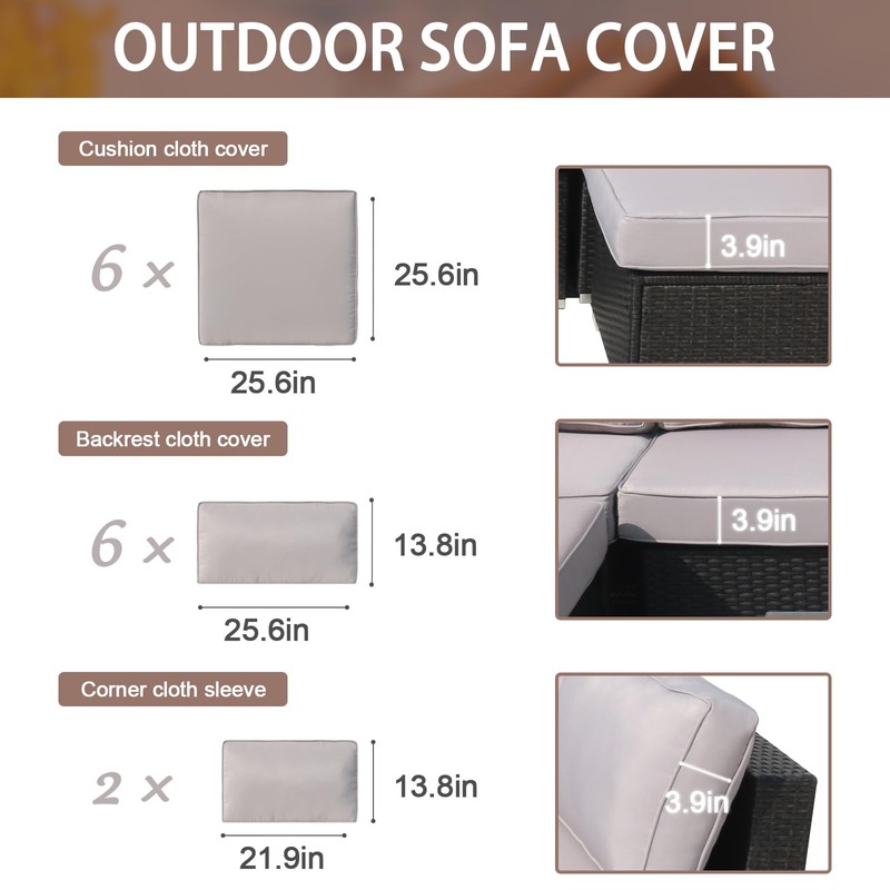 - Size &Quantity: Outdoor Patio Seat Cushion Slip Cover consists of 6 seat cushion covers (25.6x25.6x3.3.94 inches), 6 long back pillow covers (25.6x13.78x3.94 inches), 2 short back pillow covers (21.85x13.78x3.94 inches).Its fits for 7Pcs patio wicker rattan sectional sofa chairs furniture conversation set seat cushions and backrest pillow cushions