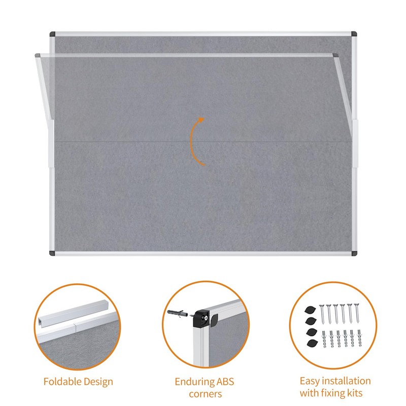 - [High Quality Details] Gray Felt surface, Anti-scratch silver finished aluminum frame, ABS plastic corner with screw-fixing in corners. It can be folded in half for saving a space and more reliable transit. This board will add a classic look to your office or home