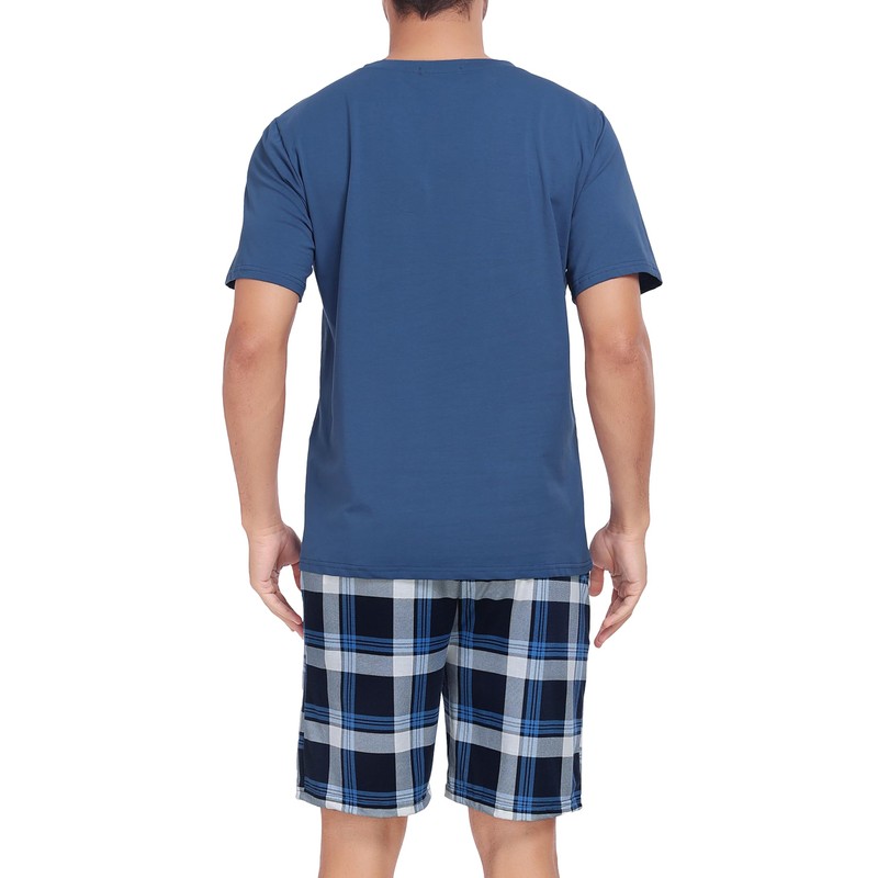 Vlazom Men's Pyjamas Set Short Sleeve Soft Pj's Top and Plaid Shorts for Sleepwear Loungewear with Pockets Dark Blue,L