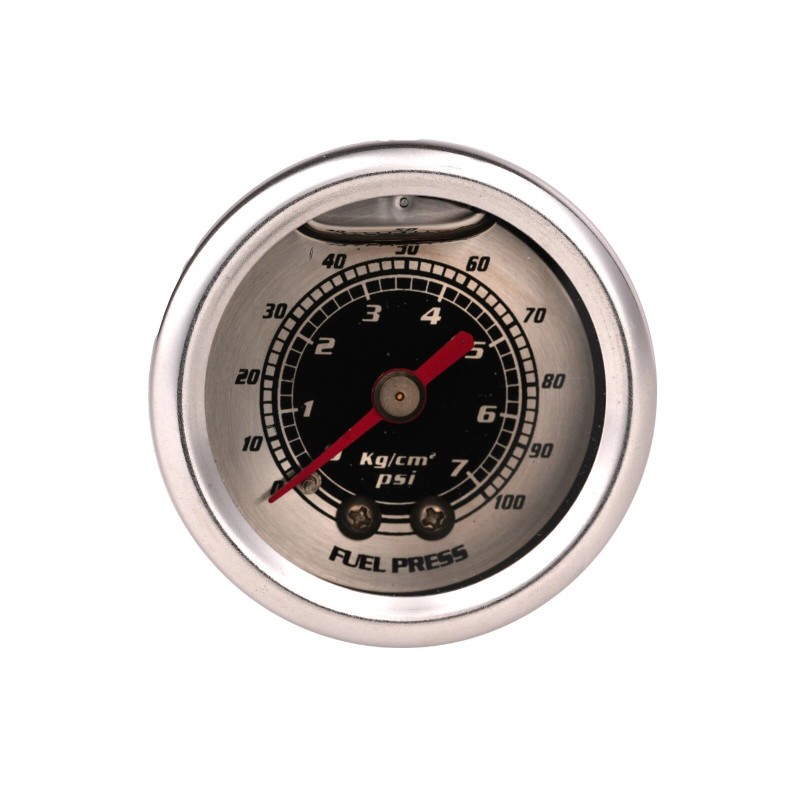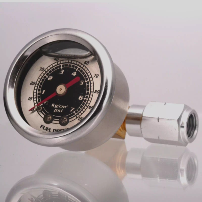 Carbon Fiber liquid filled1 1/2" (38.1MM) O.D. mechanical 0-100 PSI fuel pressure gauge for the GM LS1, LS2, LS3, LS6, LT1 and L98 engines with fuel rail adapter. Gauge reads from 0-100 psi.