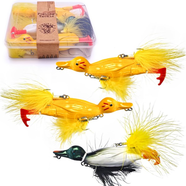 - 【REALISTIC LARGE DUCK LURES】 3 pcs big duck fishing lures with 2 different color - yellow and green. Length - 4.75in, Weight - 1.05oz. These top water duck bass lures are made to look like realistic ducks moving through the water.