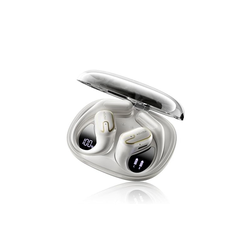 vnilrgle Open Ear Headphones 5.4 Bluetooth Sport Ear Buds with LED Digital Display IPX7 Waterproof, Wireless Earbuds Touch Control Air Conduction Stereo Sound with 18.2mm Drivers (Off White)