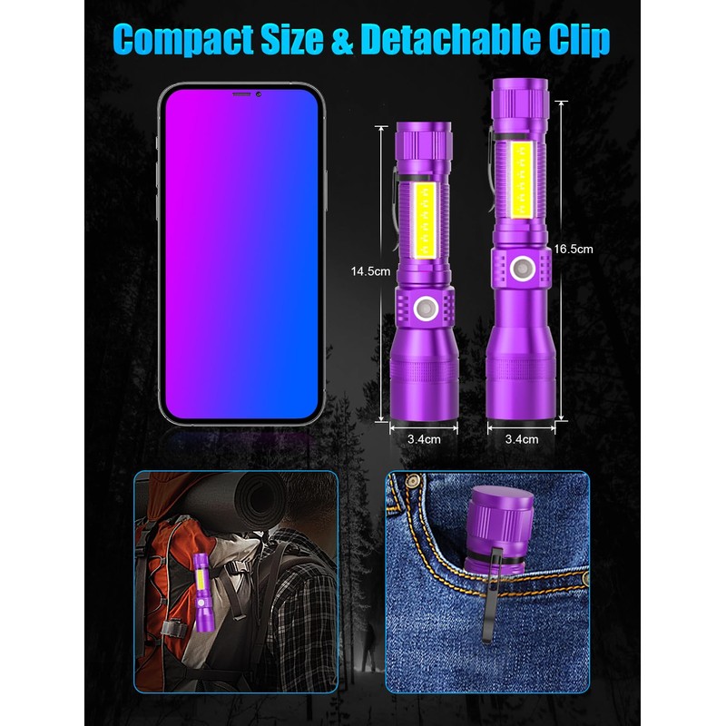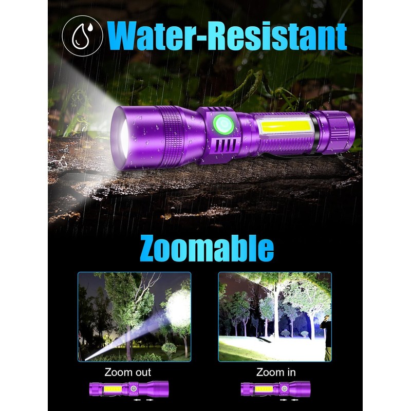 - 🔦[3 in 1 LED Flashlight]: Rechargeable Flashlight+UV Flashlights+Magnetic COB Tool Light. 395NM UV flashlight-Tactical flashlights provide 395NM black light, which is perfect for detecting what naked eye can not see. It can show invisible stains and liquids, hunt for scorpions at night, also check counterfeit ID, currency.