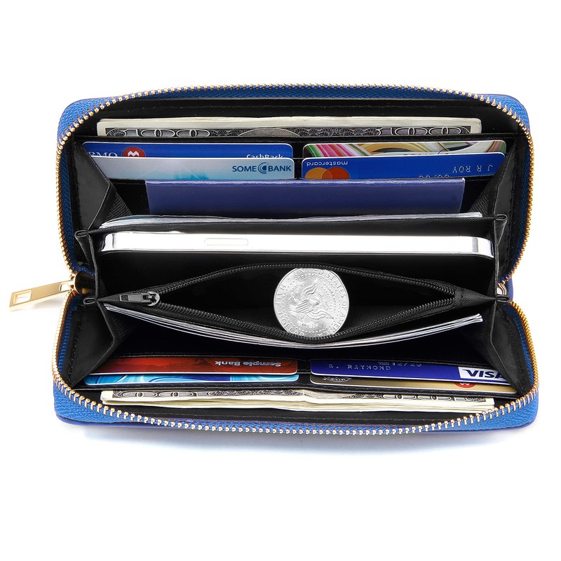 - LARGE CAPACITY:This large wallet for women includes 8 card slots, 2 receipt / checkbook slots, 2 cash / passport compartments, 1 phone holder, 1 zipper pocket. Lots of room to carry phone, cash, cards, receipts, passport, checkbook and driver license, all-in-one storage wallet makes your things organized well