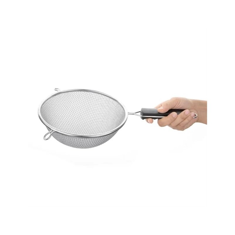 Vogue Heavy Duty Sieve 20 cm, Silver & Black, Tinned Double Mesh, Flour Sifter, Ergonomic Handle, 2x Resting Hooks, Easy Clean Design, FE742