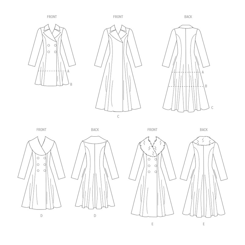 - Lined, fitted coat has double-breasted buttoned or snap closing, princess seams and shoulder pads; view A: Contrast upper collar; view E: Contrast fake fur upper collar