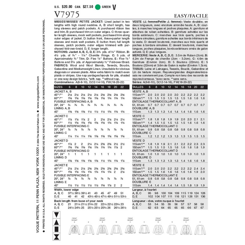 Vogue Patterns V7975 Size D 12-14-16 Misses' Petite Jacket