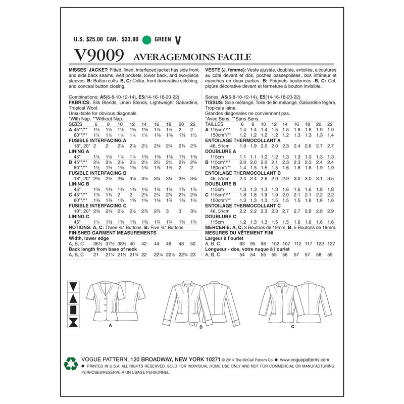 VOGUE PATTERNS V9009 Misses' Jacket Sewing Template, Size E5 (14-16-18-20-22)