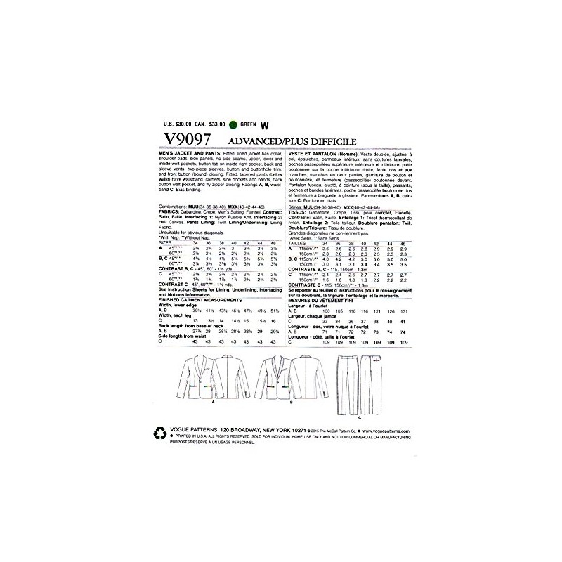 Vogue Patterns V9097MXX Men's Jacket and Pants Sewing Template, Size MXX (40-42-44-46)