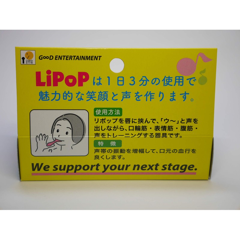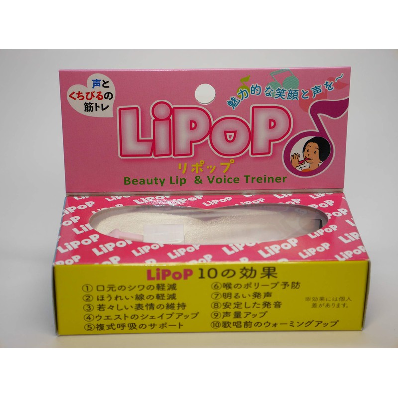LiPoP is a device for care and training the oral muscles, facial muscles, and voices around the mouth. It is very effective for your beauty, face, and beautiful posture. [LiPoP10 Effects] 1. Reduces wrinkles on the mouth, 2. Reduces cleaning lines, 3. Maintains a youthful expression, 4. Shapes the waist, 5. Supports abdominal breathing, 6. Prevents polepes in the throat, 7. Bright, 8. Stable sounds, 9. Increases the volume of your voice, warm up before singing It has also been said that it is effective in preventing swallowing. LiPoP is effective in improving the sagging of wrinkles around the mouth, just by pinching the lips. (*Effects may vary from individuals. Patent Pending Special wish 2020-215942 LiPoP is a registered trademark of GOOD ENTERTAINMENT.