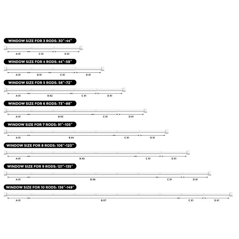 - 【HOW TO USE THE ADJUSTABLE CURTAIN ROD】Spliced white curtain rods with one adjustable end. Each set includes 6 rods (1 adjustable rod and 5 spliced rods). You can choose to use 3-6 curtain rods according to the size of your window, the whole curtain rod can be adjusted from 30 to 88 inches, suitable for windows from 48 to 84 inches.