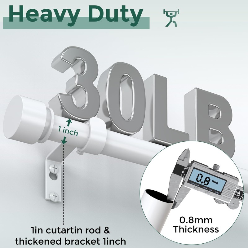 - 【 HEAVY DUTY CURTAIN ROD】Real heavy duty curtain rods, can hold up to 30 pounds. To work better with heavy curtains, in choosing materials for making curtain rods, we made the following three choices:1. We chose steel rod with 0.5% carbon content. This rod will be more sturdy and stable; 2. We chose the rod with 0.8mm thickness. Compared to other rods, ours are thicker and more durable; 3. We chose 1" diameter rod. After testing, 1" diameter curtain rod is the most reliable for windows in the range of 48-84 inch