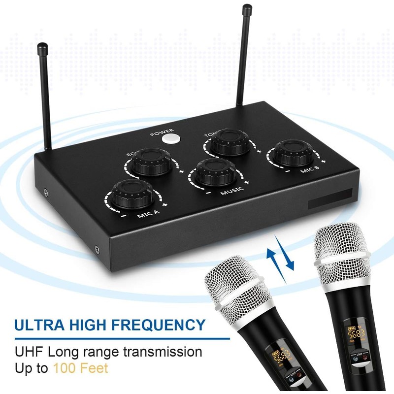 voijump Portable Karaoke Microphone Mixer System Set with Dual UHF Wireless Mic, 3.5mm AUX/Optical/Coaxial in Singing Receiver for KTV, Amplifier, Speaker, PA System, Karaoke Machine, DJ