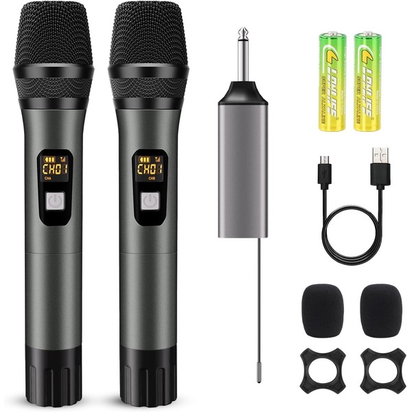 Wireless Microphone, Handheld UHF Dual Metal Cordless Dynamic Mic System with Rechargeable Receiver,200ft Range,for Karaoke, Speech, Party, Wedding, Church,Singing Machine-Auto Connect