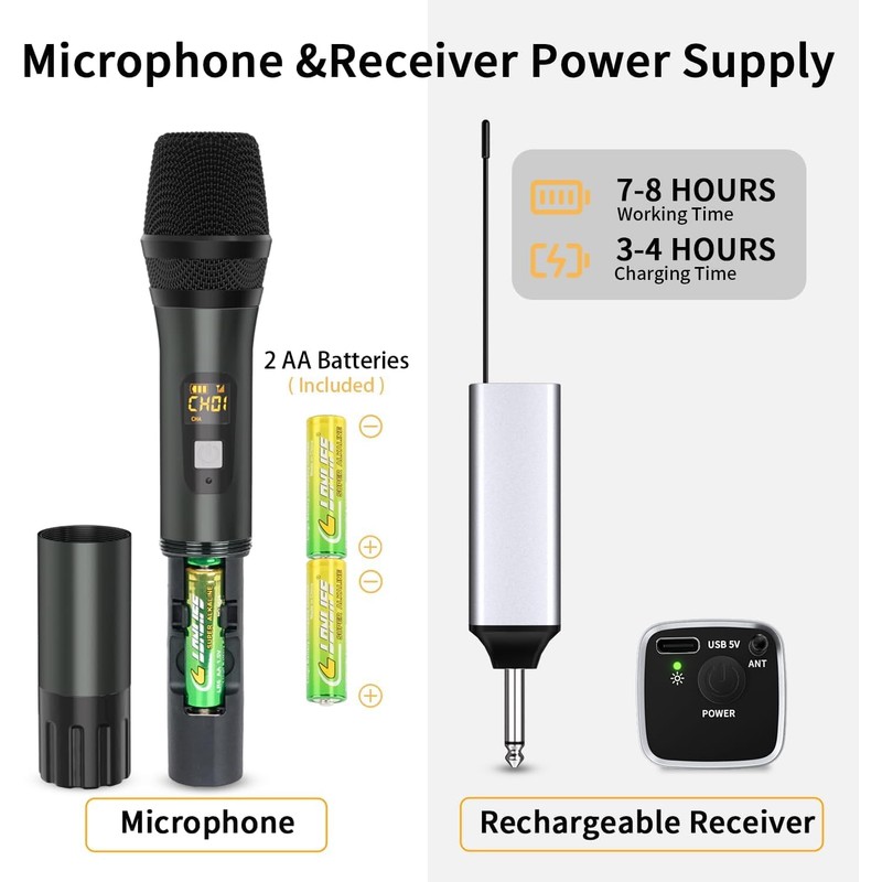 • 【Long hours of work & LCD Screen】The rechargeable microphone receiver can work for 8 hours and takes 4 hours for full charge. Single microphone requires 2 AA alkaline batteries (included). You can view the connection and the connection channel and remaining power via the LED screen on the microphone. The case also includes a 3.5mm jack