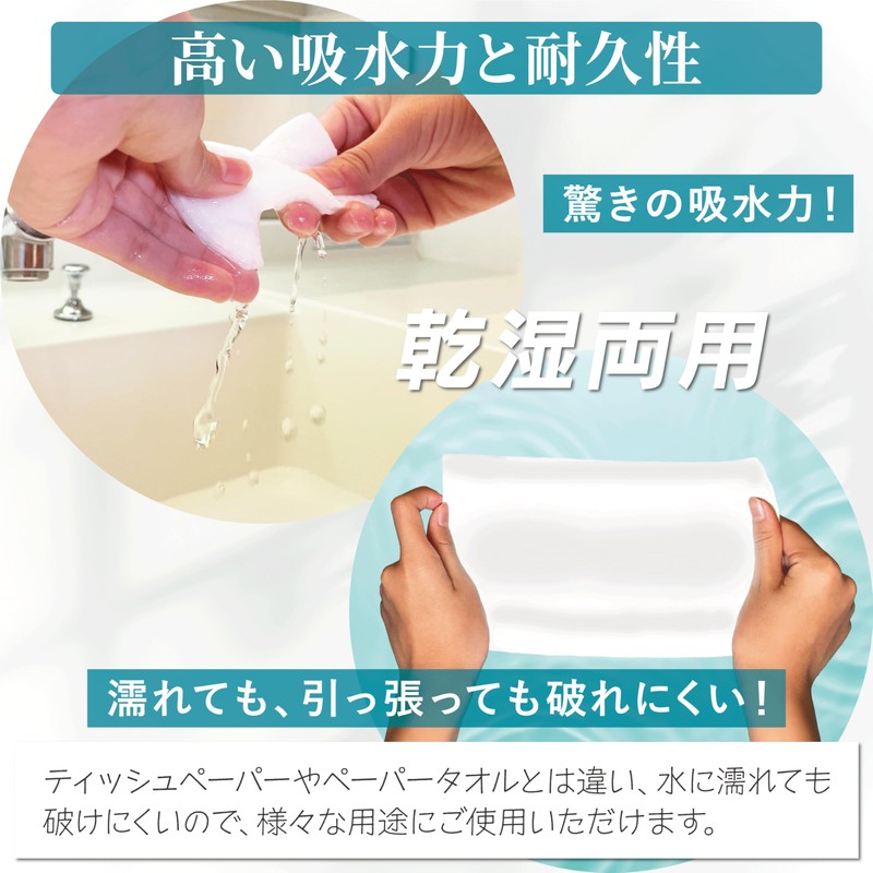 - 乾湿両用、高い吸水力と耐久性で水に濡れても破けにくいので様々な用途に