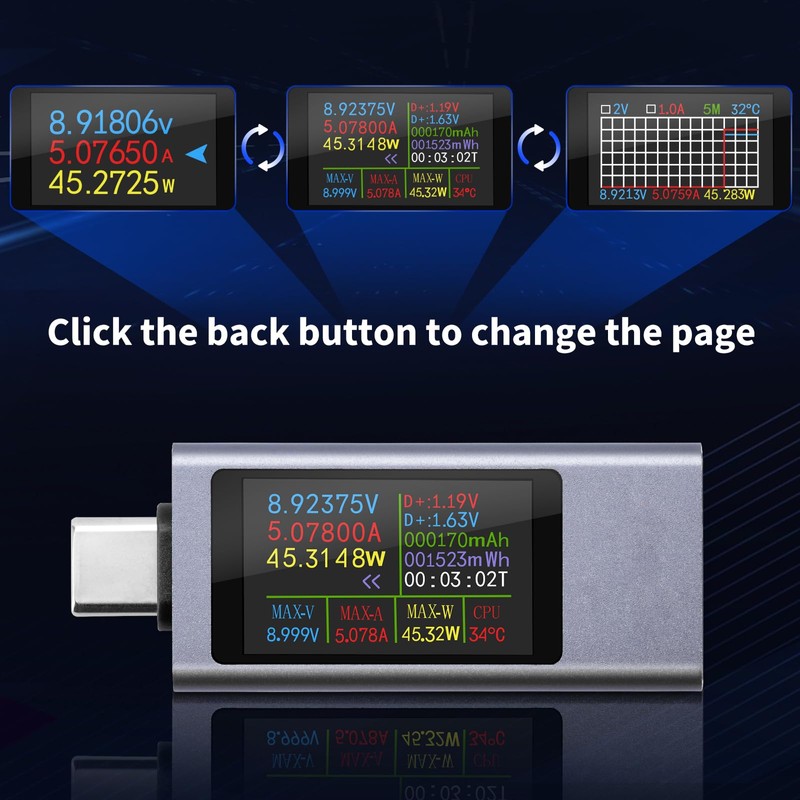 - Button Function: 1. Click the button once to cycle the screens; 2. Double click the button to rotate the displayed content; 3. Press and hold the button (3 seconds): clear all capacity, electrical quantity and time.