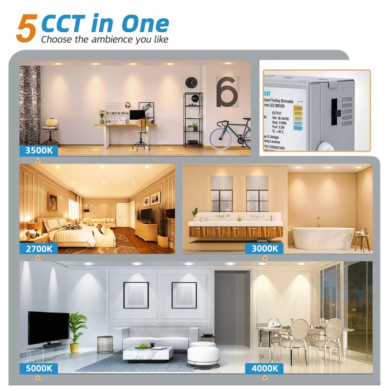 - 【5 Color Temperature】Just a slide on the side of the box, and choose 2700K/3000K/3500K/4000K/5000K-5 color temperature selectable to meet your mood, erasing the trouble of returning or replacing 3 inch led recessed light due to improper color temperature.