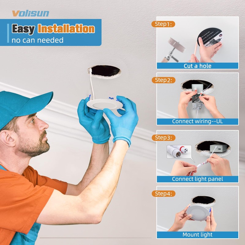 - 【Easy Installation】Volisun's 3 inch slim recessed lighting led is suitable for retrofit and new decoration: Cut a hole in ceiling with 1:1 hole template; Connect the Jbox to the cable; Use spring clip to fix it on the ceiling. It only requires as small as 2 inches ceiling spaces, fits various ceilings, and joists. Recessed can is no longer a limitation of your choice.