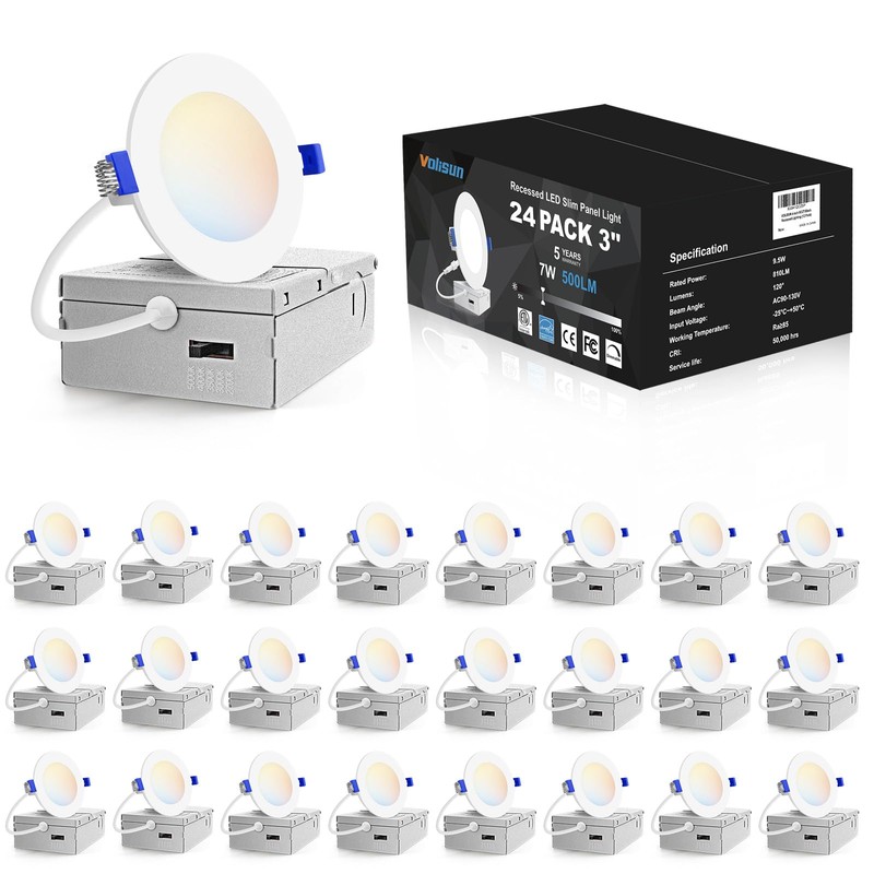 VOLISUN 24 Pack 3 inch Recessed Lighting, 5CCT LED Recessed Light with Junction Box, 2700K-5000K Selectable, Dimmable Canless Wafer Downlight, LED Ceiling Light ETL Certificated