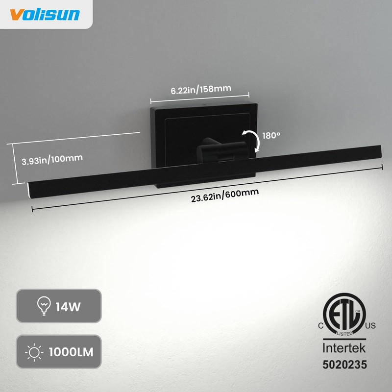 VOLISUN VOLISUN Modern Bathroom Vanity Light 24 inch, Rotatable, 14W Dimmable 5CCT Led Bathroom Light Fixture Over Mirror, Black Bar Vanity Light for Bathroom Mirror Restroom-ETL Certificated