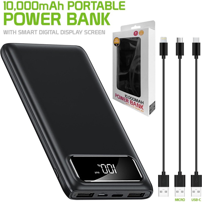 VOLT+ Portable Slim Power Pack Compatible with Alcatel PLUS 12 with 10,000mah Plus Digital Display Screen, Status Update, and 3 Cables Included! (Black)