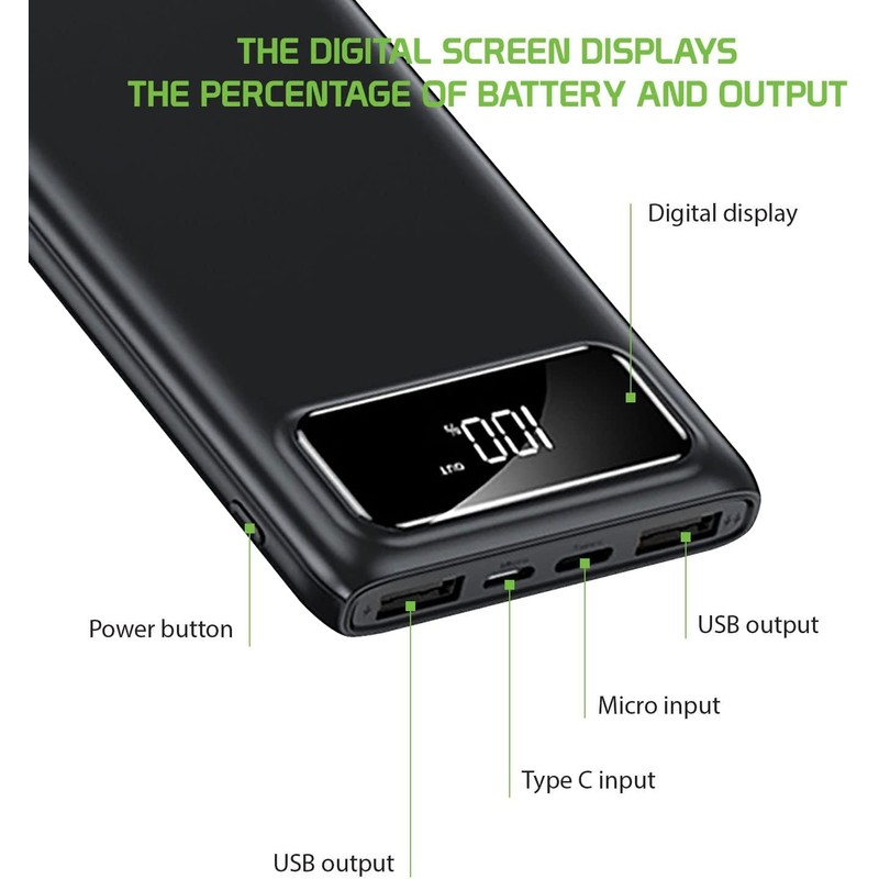 ●Digital screen displays the battery percentage and output. Universal compatibility for most smartphones, iPods, iPads, tablets, cameras, laptops and more.