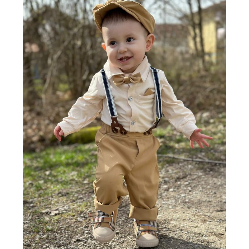 - ❀【Package】Baby boy formal outfits include 1*khaki dress romper with snaps, 1*detachable bowtie, 1*khaki pants, 1*adjustable suspenders and 1* beret hat