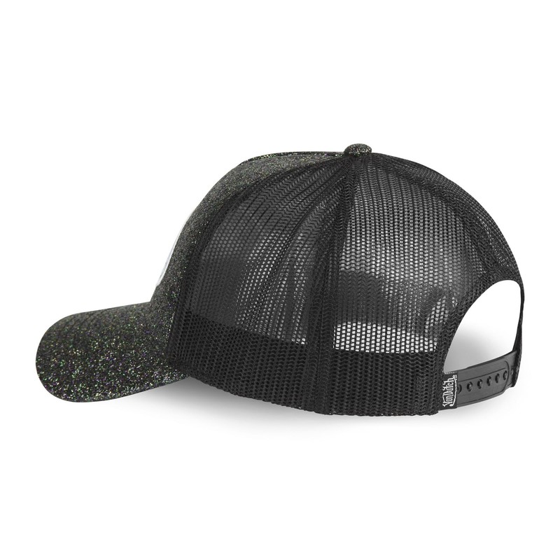 Dare to be bold with the Von Dutch Glitter Trucker Cap, featuring a Von Dutch patch on the front. Its grey and black colour, combined with a visor and front totally glittered with multi-coloured sequins (gold, green, purple), gives it a unique and festive look. Its black mesh ensures good ventilation, and the sweatband improves comfort. Made of 100% polyester, it is lightweight and durable. Its snapback adjustment allows an ideal adjustment for a head circumference of 55.5 cm to 60 cm.